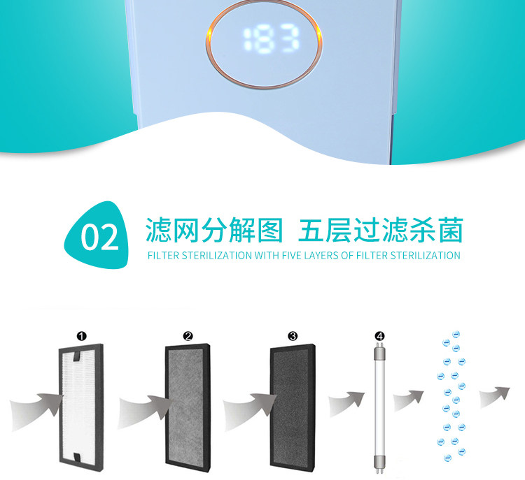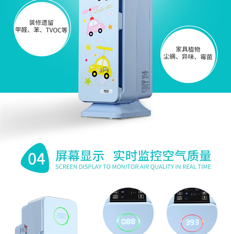 • 功能:缺氧监测 定时 除VOC 除花粉 除颗粒物 除甲醛 除烟除尘 杀菌 加氧 除雾霾 除菌, 负离子 除菌