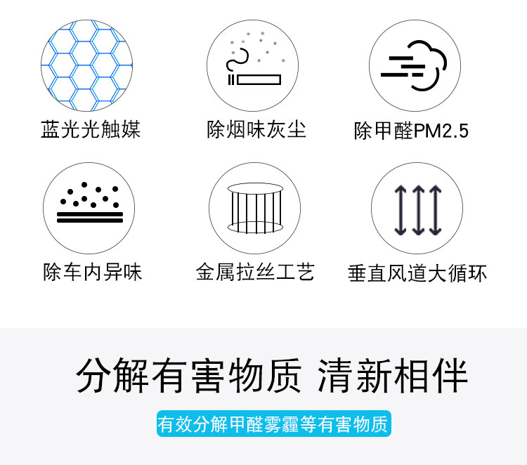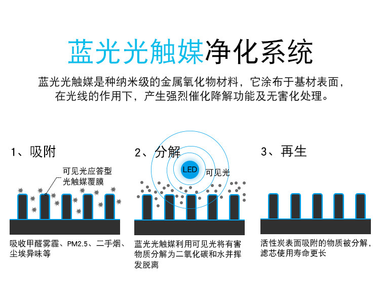 • 净化原理:HEPA滤网 光触媒 活性炭 等离子 紫外线 臭氧 负离子 静电吸附