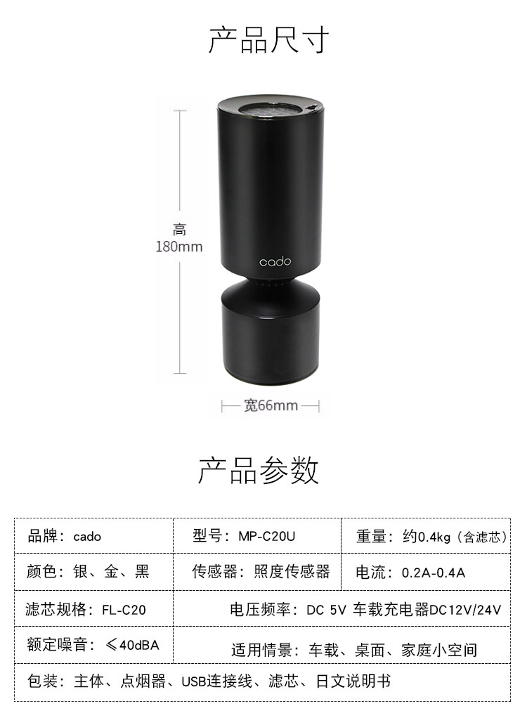 CADO日本车载空气净化器负离子活性炭除雾霾甲醛烟味异味车内USB