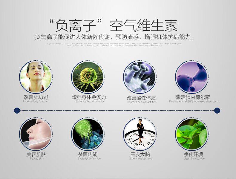 “负离子”空气维生素:负氧离子能促进人体新陈代谢、预防流感、增强机体抗病能力。改善肺功能,增强身体免疫力,改善酸性体质,激活脑内荷尔蒙,美容肌肤,杀菌功能,开发大脑,净化环境。