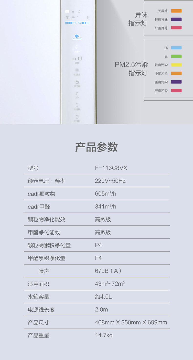 松下空气净化器家用卧室大面积除甲醛雾霾PM2.5二手烟尘F-113C8VX